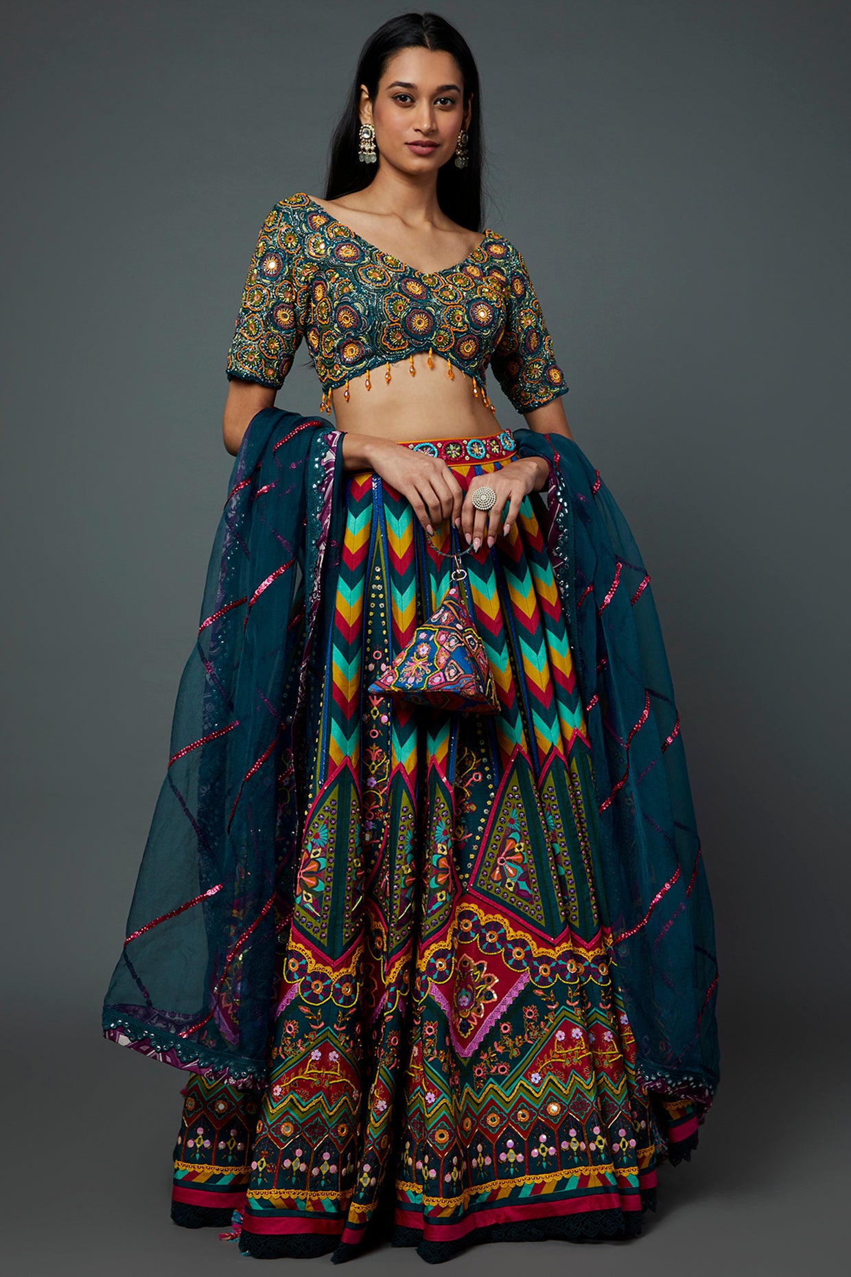 Teal Blue Raw Silk Printed & Embroidered Lehenga Set